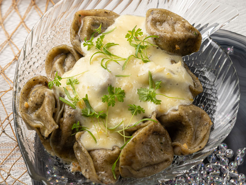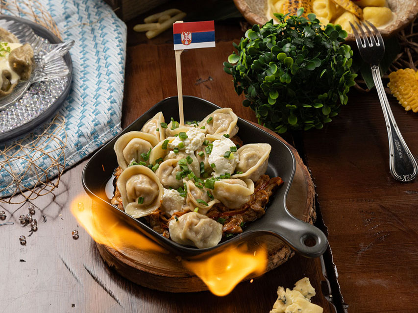 Пельмени с сербским настроением, фаршем из говядины и свинины с моцареллой на подушке из айвара