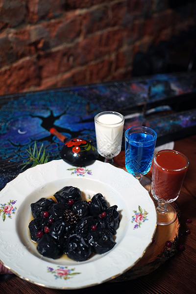 Пельмени с растомленным мясом медведя под коньячным соусом с брусникой и вареньем из шишек.